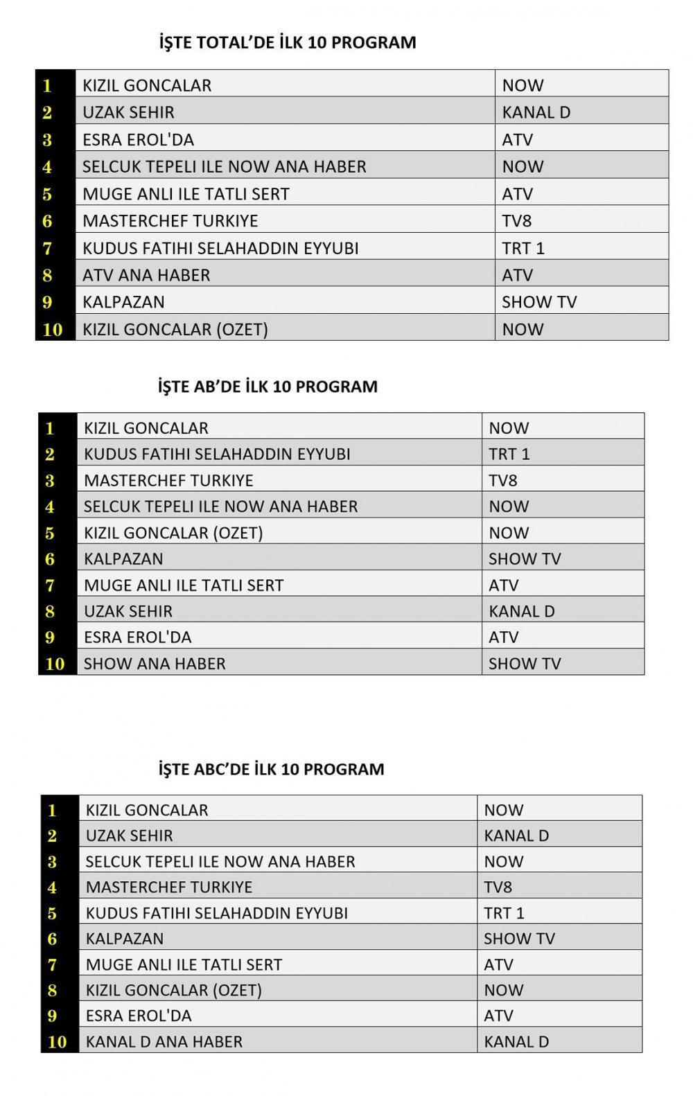 ABC kategorisinde ise 1. sırada “Kızıl Goncalar”, 2. sırada “Uzak Şehir”, ve 3. sırada “Selçuk Tepeli İle Now Ana Haber” yer aldı.