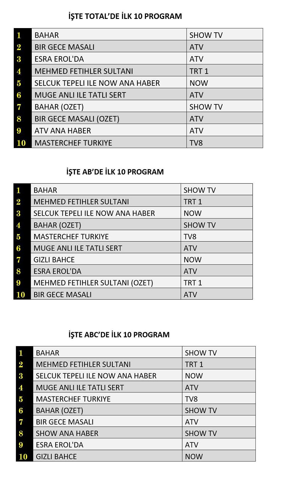 ABC'de ise 1.sırada “Bahar”, 2.sırada “Mehmed Fetihler Sultanı”, 3.sırada “Selçuk Tepeli İle Now Ana Haber” yer aldı.