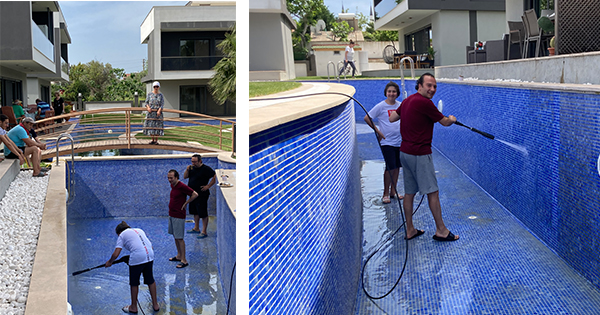 Yasaktan dolayı bahçıvan, havuz bakım ekibi gelemediği havalarda birden ısındığı için iş site sakinlerinin başına düştü. Bayrama kendi verdiğimiz emekle güzelleşen sitemizde keyifle girmek için birlikte kollarımızı sıvadık.