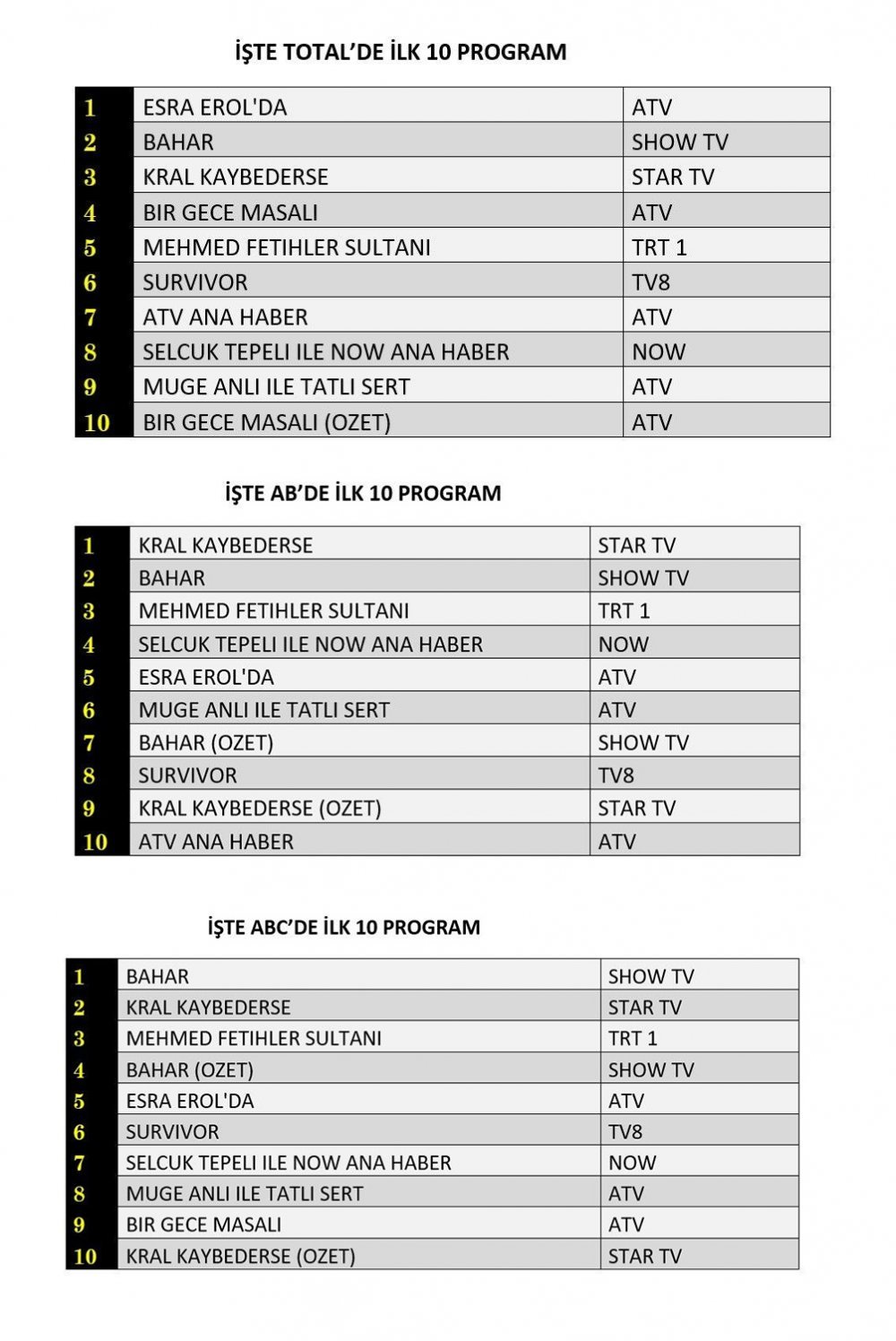 Total grubunda Esra Erol'da zirvede yer alırken, Bahar ikinci, Kral Kaybederse ise üçüncü sıraya yerleşti.