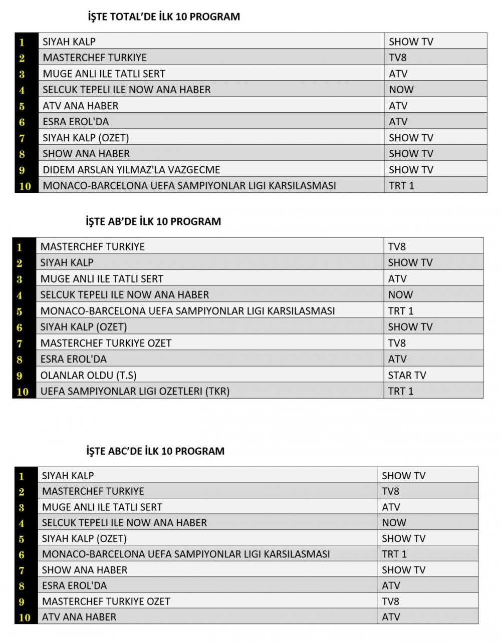 ABC'de ise 1.sırada “Siyah Kalp”, 2.sırada “Masterchef Türkiye”, 3.sırada “Müge Anlı İle Tatlı Sert” yer aldı.