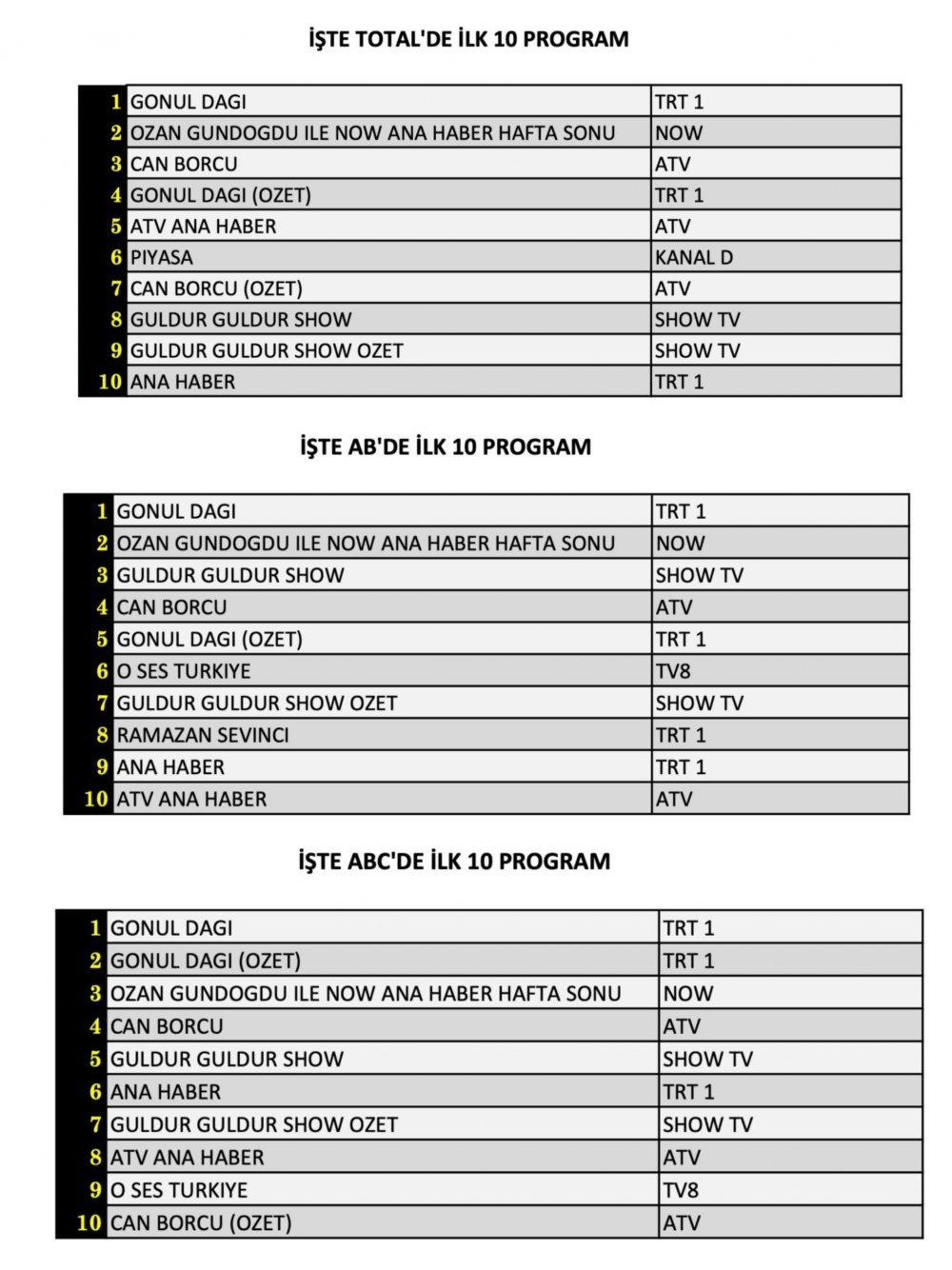 Total’de 1. sırada TRT 1’de izleyici ile buluşan “Gönül Dağı” yer aldı. Total’de 2. sırada “Ozan Gündoğdu ile NOW Ana Haber Hafta Sonu” yer aldı. Total 3. sırada ise ATV’de yayınlanan “Can Borcu”yer aldı.