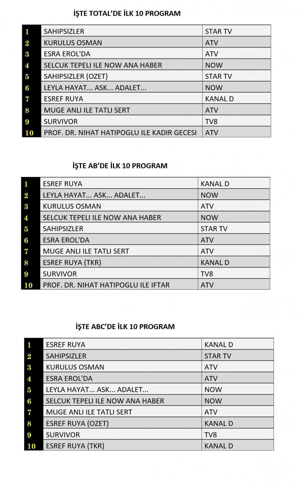 ABC grubunda ise Kanal D’nin başarılı dizisi "Eşref Rüya" birinci sırada yer aldı. Star TV’nin iddialı yapımı "Sahipsizler" ikinci sırada, "Kuruluş Osman" ise üç grupta da ilk üçte kalmayı başardı.