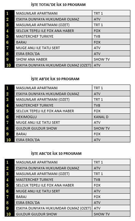 Total'de 1. sırada TRT1’de yayınlanan “Masumlar Apartmanı”, 2. sırada ATV’de ekrana gelen “Eşkıya Dünyaya Hükümdar Olmaz”, 3. sırada “Masumlar Apartmanı”nın özeti yer aldı.