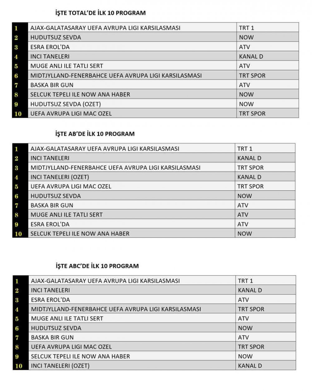 Total kategorisinde TRT1'de yayınlanan Ajax-Galatasaray UEFA Avrupa Ligi Karşılaşması, zirvenin sahibi oldu. İkinci sırada Now TV'de ekrana gelen Hudutsuz Sevda, üçüncü sırada ise Atv'de yayınlanan Esra Erol’da yer aldı.