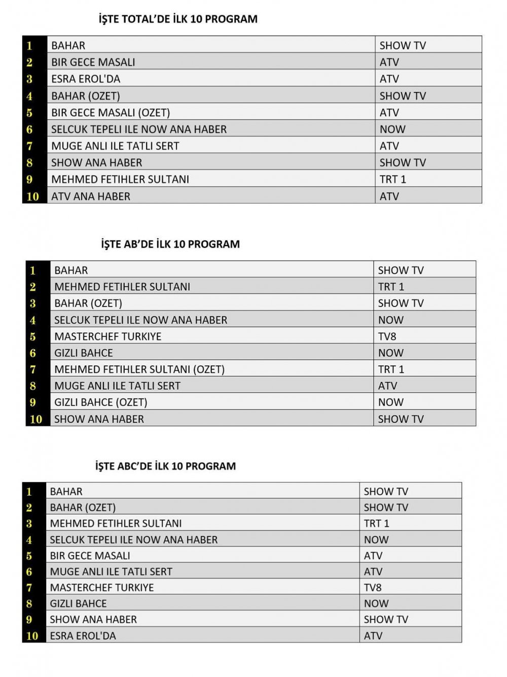 Total katagorisinde 1.sırada Show TV'nin sevilen dizisi “Bahar” birinci sırada yer aldı. 2.sırada Atv’nin popüler yapımı “Bir Gece Masalı” izleyiciyle buluştu. 3.sırada ise Atv’de yayınlanan “Esra Erol’da” programı listede yer aldı.