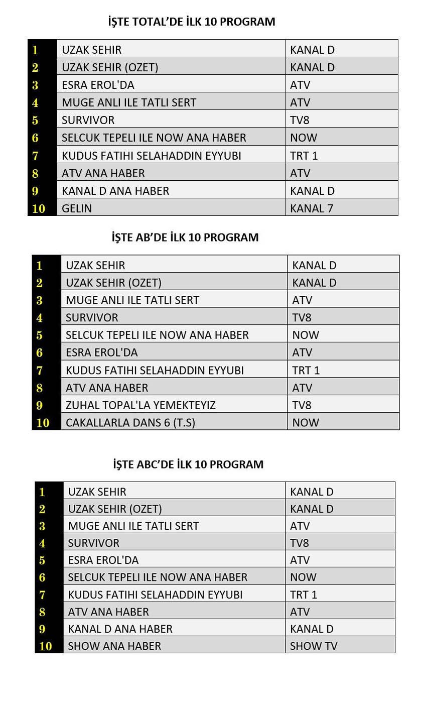 Total grubunun zirvesinde Kanal D’nin sevilen dizisi Uzak Şehir yer aldı. Dizinin özet bölümü ikinci sırayı alırken, üçüncü sırada Esra Erol’da yer aldı.