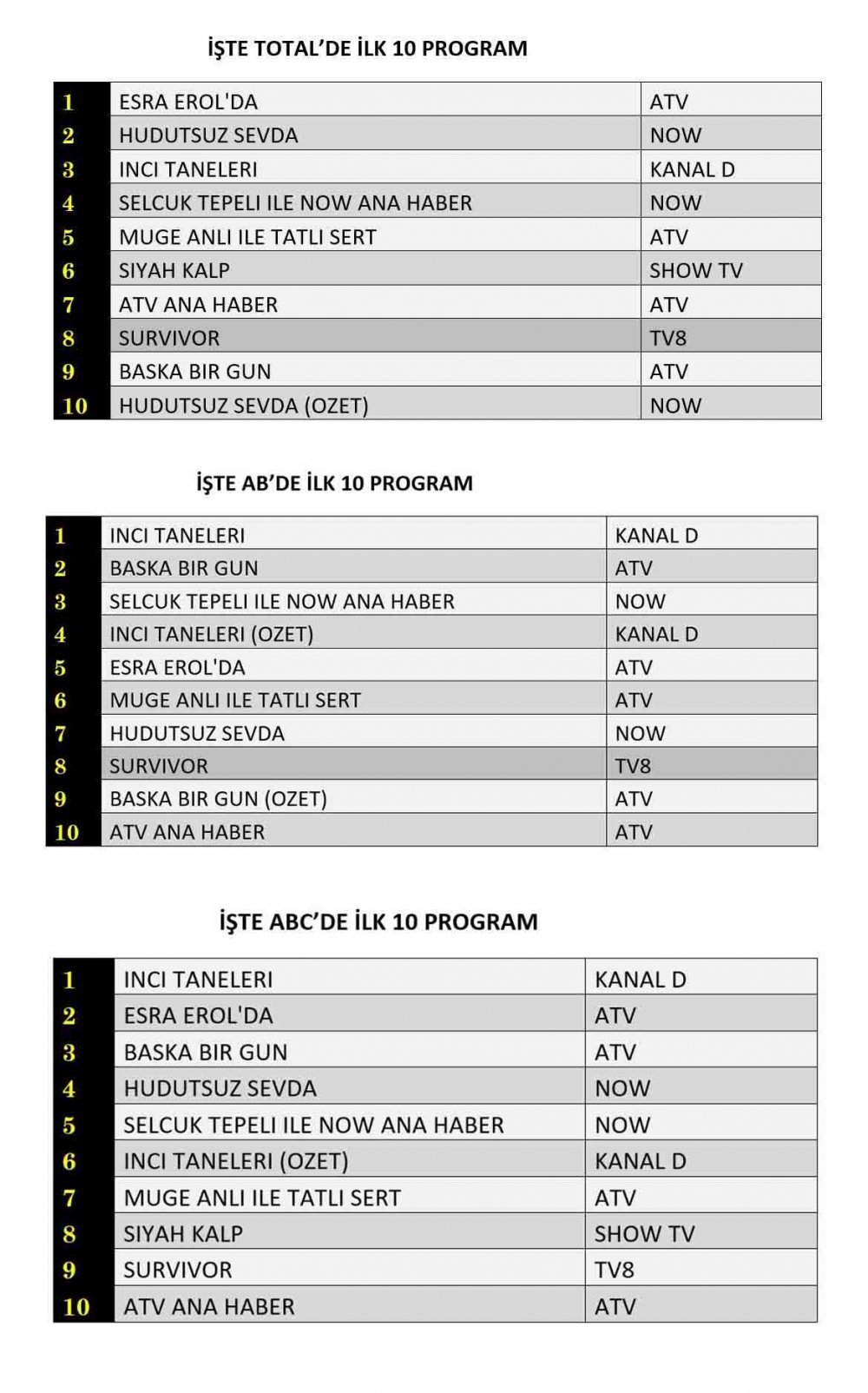 ABC kategorisinde de İnci Taneleri zirveye adını yazdırdı. Esra Erol’da, farklı kitlelere hitap eden güçlü içeriğiyle ikinci sırada yer alırken, Başka Bir Gün de ABC grubunda ilk üçe girmeyi başardı.