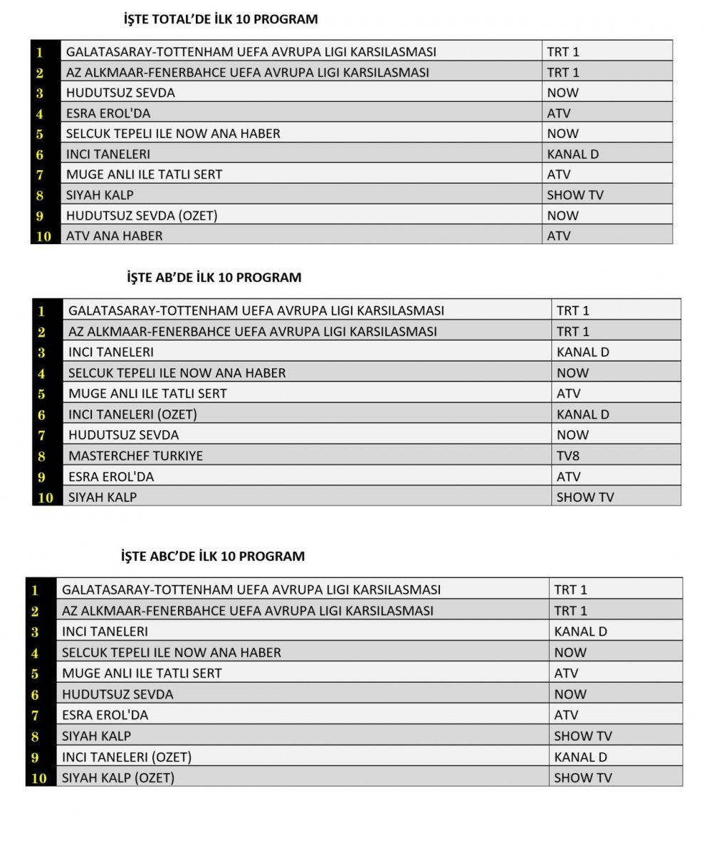 ABC'de ise 1.sırada “Galatasaray-Tottenham UEFA Avrupa Ligi Karşılaşması”, 2.sırada “Az Alkmaar-Fenerbahçe UEFA Avrupa Ligi Karşılaşması”, 3.sırada “İnci Taneleri” yer aldı.