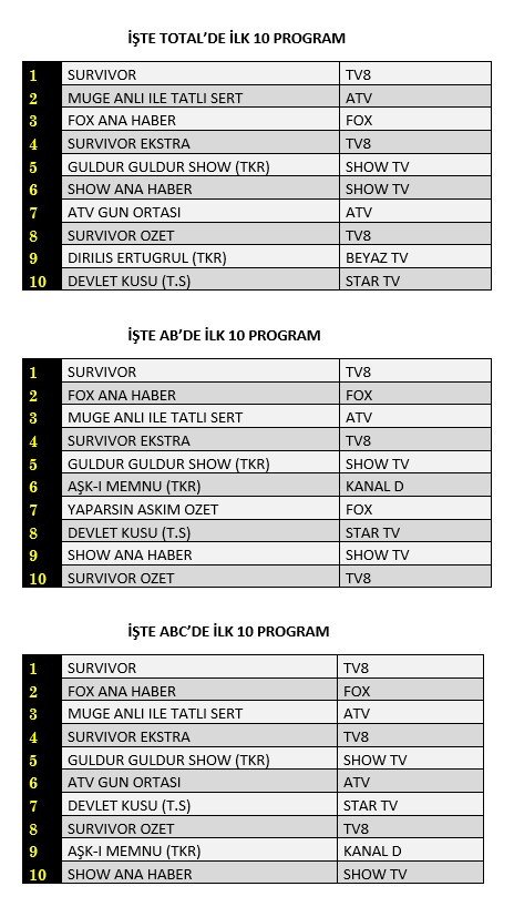 AB'de ise 1. sırada “Survivor”, 2. sırada “Fox Ana Haber”, 3. sırada “Müge Anlı İle Tatlı Sert” yer aldı.