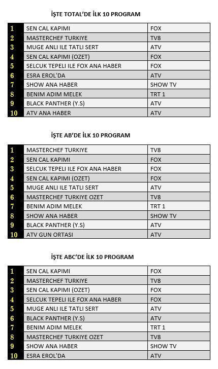 AB'de ise 1.sırada “Mastercheff Türkiye”, 2.sırada “Sen Çal Kapımı”, 3.sırada “Selçuk Tepeli İle Fox Ana Haber” yer aldı.
