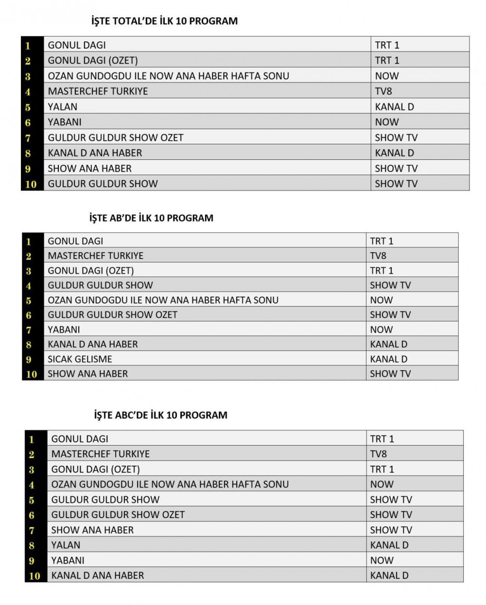 ABC'de ise 1.sırada “Gönül Dağı”, 2.sırada “Masterchef Türkiye”, 3.sırada “Gönül Dağı” dizisinin özeti yer aldı.