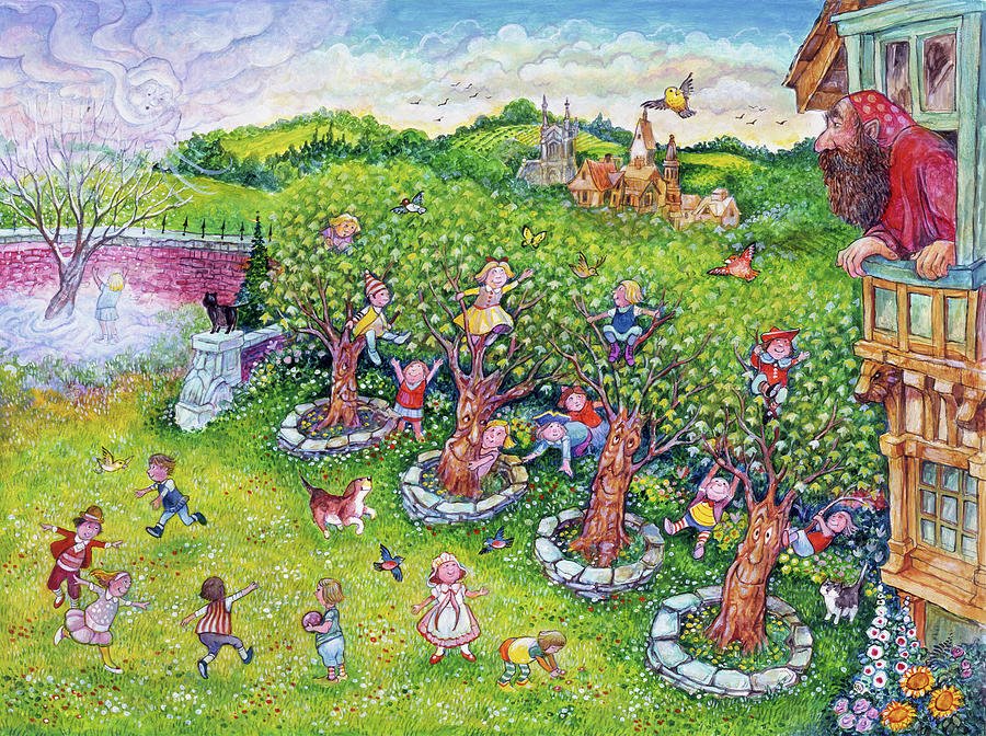 Dev dışarıya bakarken yüreği için için eridi."Nasıl da bencilmişim!" dedi, "Niçin ilkbaharın bahçeme gelmek istemediğini şimdi anlıyorum. Şu zavallı yavrucuğu ağacın üstüne çıkarayım; sonra da duvarı yıkarım, bahçem artık sonsuza dek çocukların oyun yeri olur."