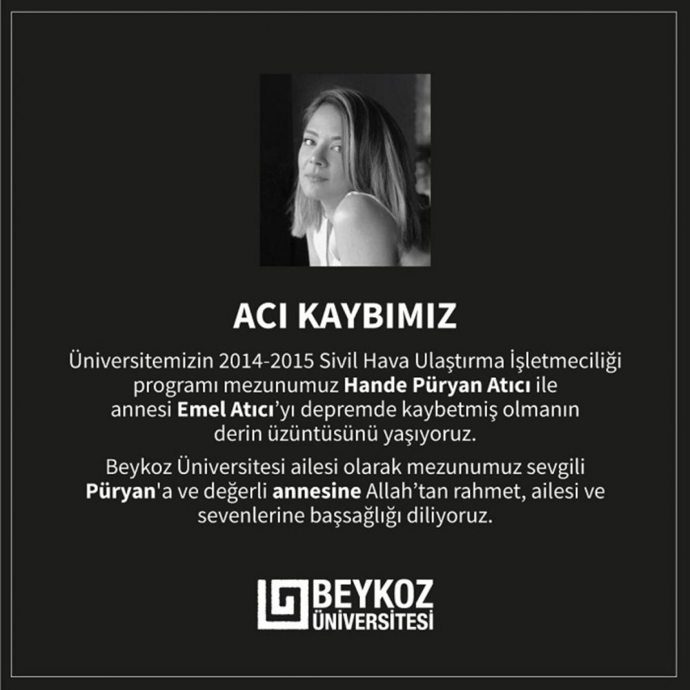 Beykoz Üniversitesi, bir taziye mesajı yayımladı; “Üniversitemizin 2014-2015 Sivil Hava Ulaştırma İşletmeciliği programı mezunumuz Hande Püryan Atıcı ile annesi Emel Atıcıʼyı depremde kaybetmiş olmanın derin üzüntüsünü yaşıyoruz. Beykoz Üniversitesi ailesi olarak mezunumuz sevgili Püryan’a ve değerli annesine Allahʼtan rahmet, ailesi ve sevenlerine başsağlığı diliyoruz.”