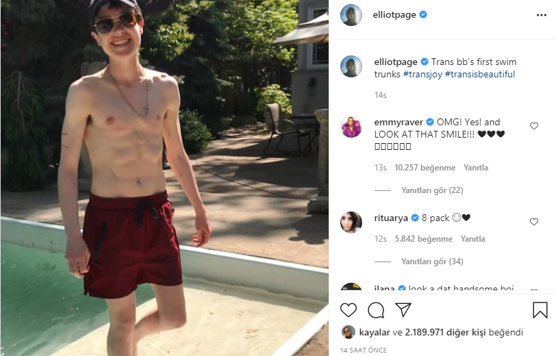 34 yaşındaki Elliot Page, son fotoğrafında trans bir erkek olarak ilk üstsüz fotoğrafını sosyal medyada paylaştı. Kırmızı mayosu ile kameraya gülümseyen oyuncu; fotoğrafı paylaştıktan sonra pek çok ünlüden, arkadaşlarından ve hayranlarından destekleyici yorum aldı.