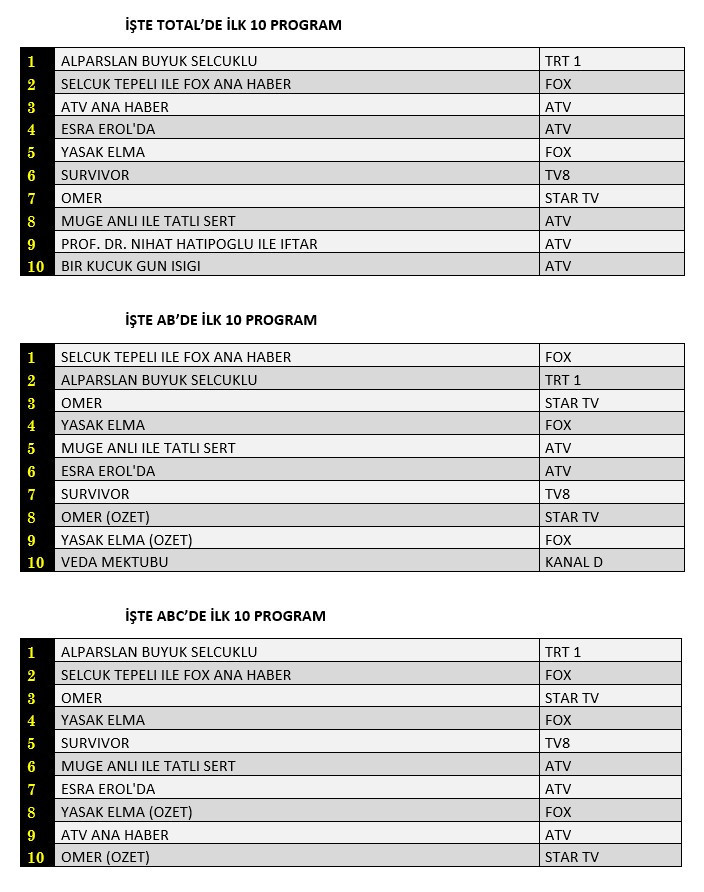 AB'de ise 1. sırada “Selçuk Tepeli İle Fox Ana Haber”, 2. sırada “Alparslan Büyük Selçuklu”, 3. sırada Star TV’de yayınlanan “Ömer” yer aldı.