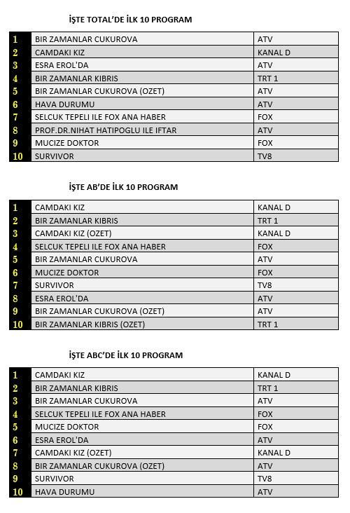 Total'de 1. sırada ATV’de ekrana gelen “Bir Zamanlar Çukurova”, 2. sırada Kanal D’de yayınlanan “Camdaki Kız”, 3. sırada ATV’de izleyiciyle buluşan “Esra Erol’da” programı yer aldı.