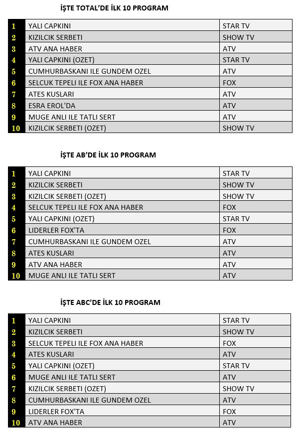 Total'de 1. sırada Star TV’de izleyiciyle buluşan “Yalı Çapkını”, 2. sırada Show TV’de yayınlanan “Kızılcık Şerbeti”, 3. sırada “Atv Ana Haber” yer aldı.