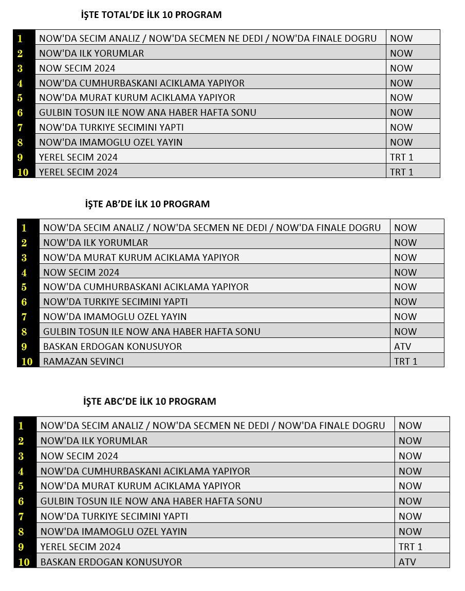 ABC'de ise 1.sırada “Now'da Seçim Analiz / Now'da Seçmen Ne Dedi / Now'da Finale Doğru”, 2. sırada “Now’da İlk Yorumlar”, 3.sırada “Now Seçim 2024” yer aldı.