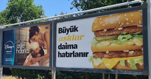 Yan yana yer alan iki billboardda, bir yanda Disney+ dizisi Aşkı Hatırla’nın başrolleri romantik bir sahnede görenleri selamlarken, diğer yanda markanın hamburgeri “Büyük Aşklar Daima Hatırlanır” sloganıyla boy gösteriyor.