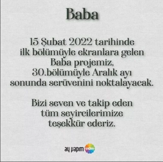 Son olarak 25. bölümüyle ekrana gelen Baba dizisi, Aralık ayı sonunda yayınlanacak olan 30. bölümüyle birlikte ekran macerasını sonlandıracak. Dizinin final kararı da resmi sosyal medya hesabından duyuruldu.