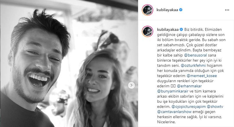 Rol arkadaşı Bensu Soral ile son set gününde çekilen bir kareyi paylaşan Kubilay Aka, "Biz bitirdik. Elimizden geldiğince çalışıp çabalayıp sizlere son iki bölüm bıraktık geride. Bu sabah son set sabahımızdı. Çok güzel dostlar arkadaşlar edindim. Başta bembeyaz bir kalbe sahip Bensu Soral sana binlerce teşekkürler her şey için iyi ki tanıdım seni" notunu yazdı.