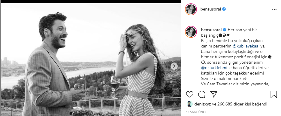 Ve Cam Tavanlar dizimizin yayınında, yapımında, kamera önünde-kamera arkasında emeği geçen tüm arkadaşlarımın ellerine sağlık. Sizinle çalışmak çok ama çok eğlenceliydi! Hepinizi çoooook seviyorum. Her şey kötüye gidiyormuş gibi olduğunda, durup bir elma ye. Önce bir dur yani, Biz hep öyle yapıyoruz" ifadelerini kullandı.
