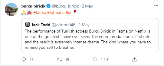 Burcu Biricik, Jack Todd’un bu tweet’ini retweet ederek emoji ile teşekkürlerini iletti. Todd, Burcu Biricik ve Fatma dizisi için şunları yazdı: “Türk oyuncu Burcu Biricik’in Fatma’da Netflix’teki performansı, şimdiye kadar gördüğüm en büyük performanslardan biri. Tüm prodüksiyon birinci sınıf ve sonuç son derece yoğun bir dram. Kendinize nefes almayı hatırlatmanız gereken türden.”