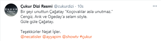 Çukur dizisinin resmi sosyal medya hesabından da Nejat İşler'e veda paylaşımı yapıldı. Paylaşımda "Bir şeyi unuttun Çağatay 'Koçovalılar asla unutmaz'. Cengiz, Arık ve Ogeday'a selam söyle. Güle güle Çağatay. Teşekkürler Nejat İşler" notu yazıldı.