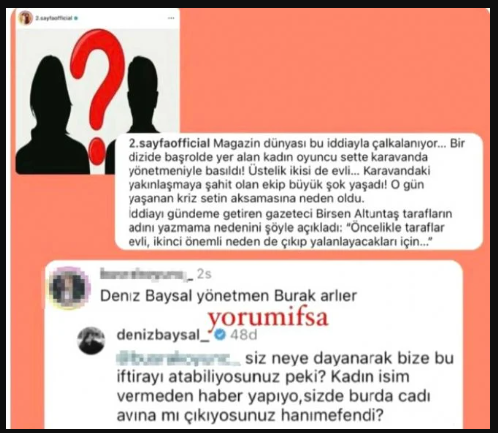 2019 yılında şarkıcı Barış Yurtçu ile nikah masasına oturan ve adı yasak aşk skandalına karışan 31 yaşındaki Deniz Baysal, bir kadın kullanıcının "Deniz Baysal, yönetmen Burak Arlıer" yorumuna "Siz neye dayanarak bize bu iftirayı atabiliyorsunuz peki? Kadın isim vermeden haber yapıyor, siz de burada cadı avına mı çıkıyorsunuz hanımefendi?" cevabını verdi.