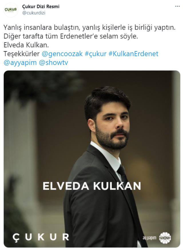 Çukur dizisinin sosyal medya hesabından yapılan veda paylaşımında "Yanlış insanlara bulaştın, yanlış kişilerle iş birliği yaptın. Diğer tarafta tüm Erdenetler'e selam söyle. Elveda Kulkan. Teşekkürler Genco Özak" notu düşüldü.