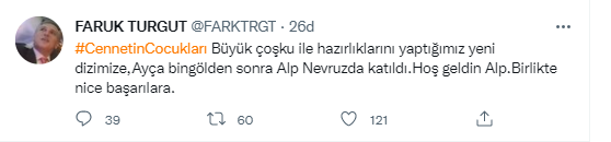 Alp Navruz TRT1'de yayınlanan Masumlar Apartmanı dizisinin yerine gelecek olan Cennet'in Çocukları adlı dizide rol alacak. Senaryosu Atike Hınçlıer'in "Yürek Çıkmazı" kitabından esinlenilen dizinin senaristliğini Ayla Hacıoğulları ve Vilmer Özçınar yapıyor.