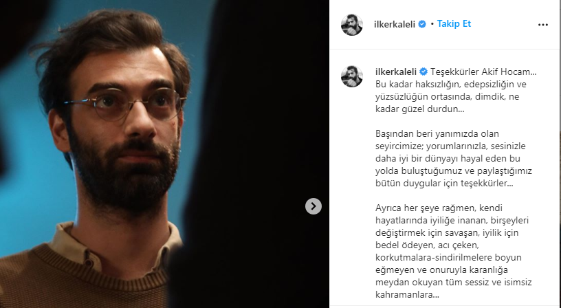 İlker Kaleli, Instagram hesabından yaptığı veda paylaşımında "Teşekkürler Akif Hocam...Bu kadar haksızlığın, edepsizliğin ve yüzsüzlüğün ortasında, dimdik, ne kadar güzel durdun" dedi ve şu ifadleri kullandı: "Teşekkürler Akif Hocam... Bu kadar haksızlığın, edepsizliğin ve yüzsüzlüğün ortasında, dimdik, ne kadar güzel durdun...