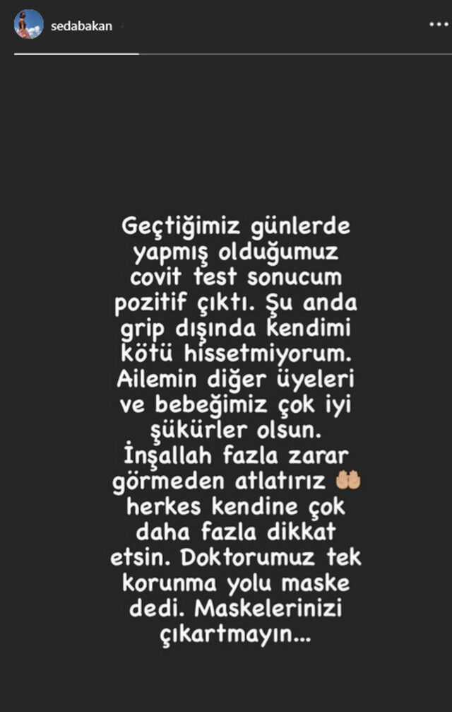 Bakan paylaşımında şu ifadeleri kullandı; "Geçtiğimiz günlerde yapmış olduğumuz covid test sonucum pozitif çıktı. Şu anda grip dışında kendimi kötü hissetmiyorum. Ailemin diğer üyeleri ve bebeğimiz çok iyi şükürler olsun. İnşallah fazla zarar görmeden atlatırız. Herkes kendine çok daha fazla dikkat etsin. Doktorumuz 'Tek korunma yolu maske' dedi. Maskelerinizi çıkartmayın"
