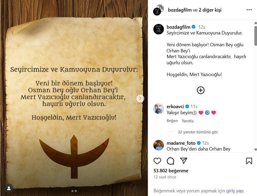 Bozdağ Film yaptığı duyuruda "Yeni dönem başlıyor! Osman Bey oğlu Orhan Bey’i Mert Yazıcıoğlu canlandıracaktır, hayırlı uğurlu olsun. Hoş geldin, Mert Yazıcıoğlu!” diyerek yeni sezonda yer alacağını duyurdu.