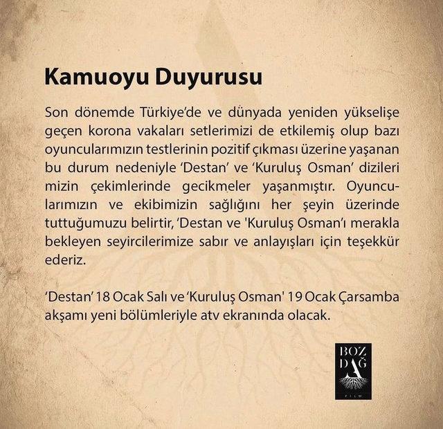 Bozdağ Film'den yapılan açıklamada her iki dizide de oyuncular arasında koronavirüs vakaları görüldüğü belirtildi. Açıklamada şu ifadeler kullanıldı: "Son dönemde Türkiye'de ve dünyada yeniden yükselişe geçen korona vakaları setlerimizi de etkilemiş olup, bazı oyuncularımızın testlerinin pozitif çıkması üzerine yaşanan bu durum nedeniyle 'Destan' ve 'Kuruluş Osman' dizilerimizin çekimlerinde gecikmeler yaşanmıştır. Oyuncularımızın ve ekibimizin sağlığını her şeyin üzerinde tuttuğumuzu belirtir, Destan ve Kuruluş Osman'ı merakla bekleyen seyircilerimize sabır ve anlayışları için teşekkür ederiz. Destan 18 Ocak Salı, Kuruluş Osman da 19 Ocak Çarşamba akşamı yeni bölümleriyle atv ekranlarında olacak."
