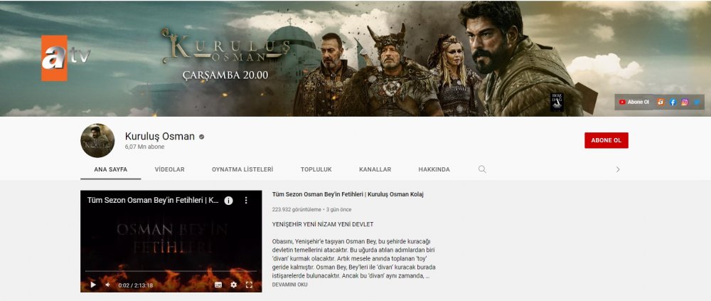 atv ekranlarında heyecanla izlenen, yayınlandığı her bölümle reytinglerin zirvesinde yer alan Kuruluş Osman'ın, 4. Sezon ilk bölümünün yayınlanmasından sonra YouTube'da ‘6 Milyon abone’ yi geçti.