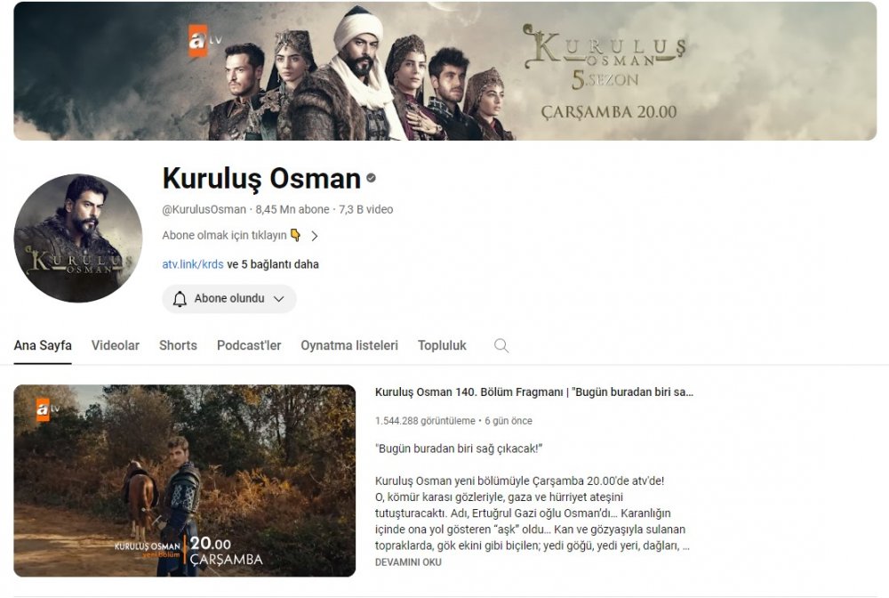 Türkçe başta olmak üzere Arapça, Urduca, Japonca, İspanyolca kanallarındaki abonelerinin toplamı Youtube’da 17 milyona yaklaşan ve 11 Milyar izlenme elde eden Kuruluş Osman tartışmasız Türkiye’nin en büyük dizi kanalı unvanını da elinde tutuyor.