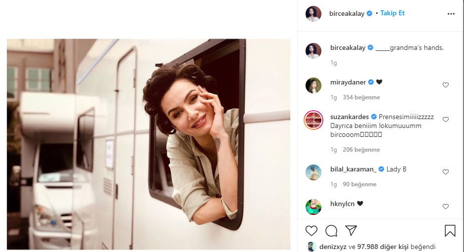 İbrahim Çelikkol'la başrolü paylaşan Birce Akalay setten ilk kareyi sosyal medya hesabından paylaştı. Setteki karavanında sahne sırasının gelmesini bekleyen oyuncu, gönderisine İngilizce olarak “Büyükannemin elleri” notunu düştü.