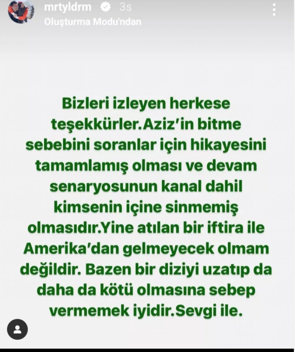 Sebep olarak Murat Yıldırım'ın Amerika'da olması iddilarına Murat Yıldırım sosyal medya hesabından yanıt verdi ve açıklamada "Aziz'in bitme nedenini soranlar için; hikayesinin bitmiş olması ve devam senaryosunun kanal dahil kimsenin içine sinmemiş olmasıdır." diye duyurdu.