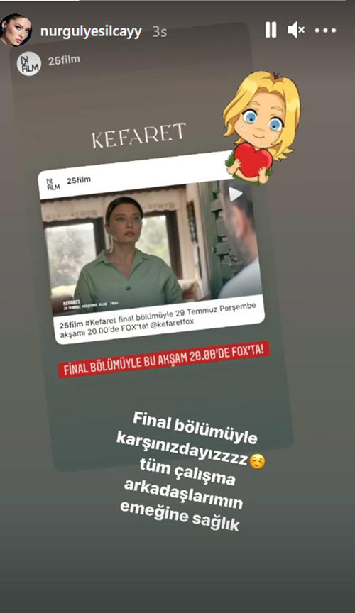 Dizinin başrol oyuncularından Nurgül Yeşilçay, Instagram'dan yaptığı paylaşımda "Final bölümüyle karşınızdayız. Tüm çalışma arkadaşlarımızın eline sağlık" notunu yazdı.