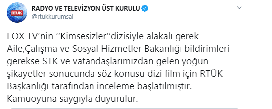 RTÜK'ten yapılan açıklamada, FOX'un 'Kimsesizler' dizisiyle alakalı gerek Aile, Çalışma ve Sosyal Hizmetler Bakanlığı bildirimleri gerekse STK ve vatandaşlarımızdan gelen yoğun şikayetler sonucunda söz konusu dizi film için RTÜK Başkanlığı tarafından inceleme başlatılmıştır. Kamuoyuna saygıyla duyurulur" denildi.