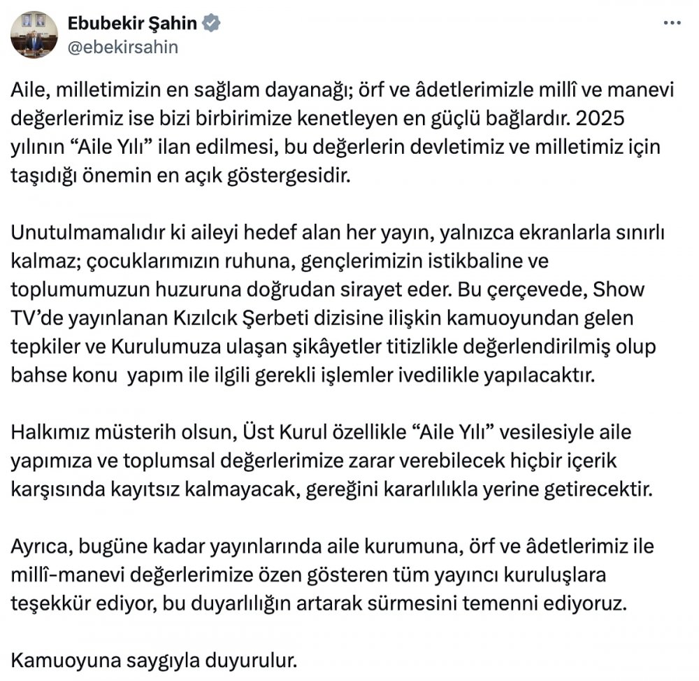 Unutulmamalıdır ki aileyi hedef alan her yayın, yalnızca ekranlarla sınırlı kalmaz; çocuklarımızın ruhuna, gençlerimizin istikbaline ve toplumumuzun huzuruna doğrudan sirayet eder. Bu çerçevede, Show TV’de yayınlanan Kızılcık Şerbeti dizisine ilişkin kamuoyundan gelen tepkiler ve Kurulumuza ulaşan şikâyetler titizlikle değerlendirilmiş olup bahse konu yapım ile ilgili gerekli işlemler ivedilikle yapılacaktır.