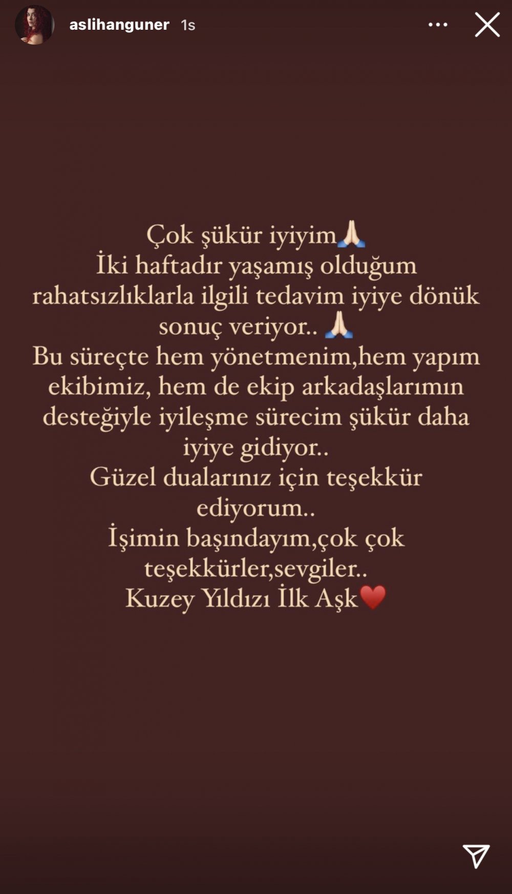 Güzel dualarınız için teşekkür ediyorum. İşimin başındayım çok çok teşekkürler, sevgiler.” açıklamasında bulundu. Aslıhan Güner’in sağlık sıkıntısı yaşadığı süreçte bölüm çekimlerini güçlükle tamamlayarak dizi çekimlerini aksatmadığı da gelen duyumlar arasında.