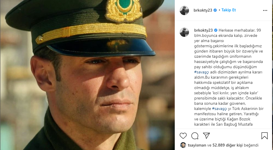 Ayrılık kararına dair bir şey söylemeyeceğini belirten oyuncu şu ifadeleri kullandı; "Herkese merhabalar. 99 bölüm boyunca ekranda kalıp, zirvede yer alma başarısı göstermiş, çekimlerine ilk başladığımız günden itibaren büyük bir özveriyle ve üzerimde taşıdığım üniformanın hassasiyetiyle çalıştığım ve başarısında pay sahibi olduğumu düşündüğüm #savaşçı adlı dizimizden ayrılma kararı aldım. Bu kararımın gerekçeleri hakkımda spekülatif bir açıklama olmadığı müddetçe, iş ahlakım sebebiyle 'kol kırılır, yen içinde kalır' prensibimde saklı kalacaktır.