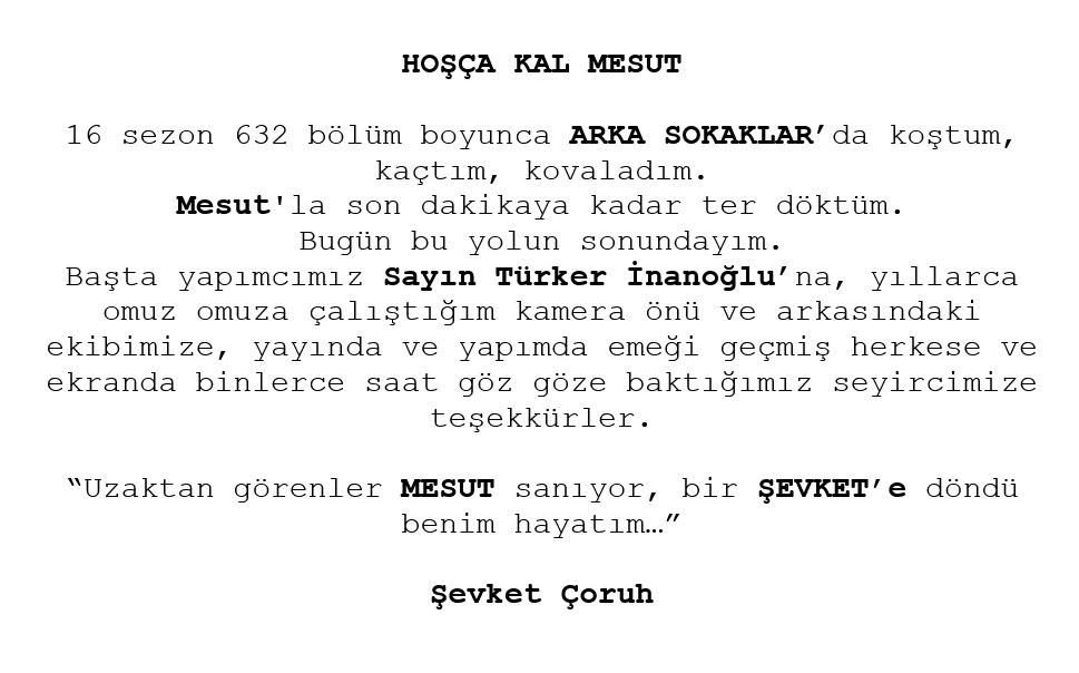 Yeni sezonda Arka Sokaklar dizisinde yer almayacak olan Şevket Çoruh, diziye bir paylaşımla veda etti.