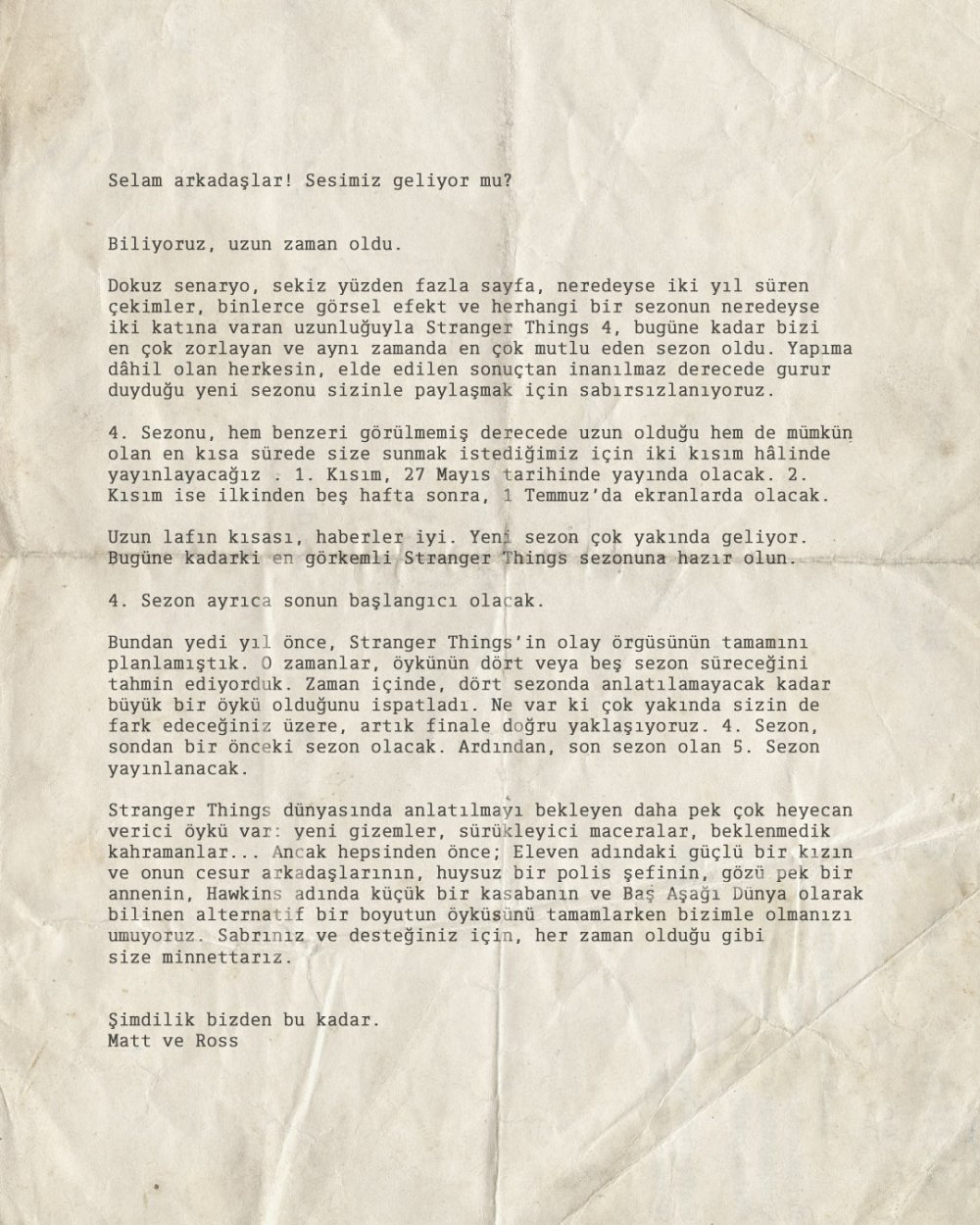 Stranger Things’in yaratıcıları Duffer Kardeşler, hayranlara yazdıkları açık mektupta yeni bölümlerin Netflix’te ne zaman yayınlanacağını açıklarken, dizinin geleceğiyle ilgili diğer haberleri paylaştı.