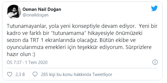 Tutunamayanlar dizisinin yönetmeni Osman Nail Doğan, kişisel Twitter hesabından yeni sezonla ilgili önemli açıklamalarda bulundu. Doğan, paylaşımında: "Tutunamayanlar, yola yeni konseptiyle devam ediyor. Yeni bir kadro ve farklı bir “tutunamama” hikayesiyle önümüzeki sezon da TRT 1 ekranlarında olacağız. Bütün ekibe ve oyuncularımıza emekleri için teşekkür ediyorum. Sürprizlere hazır olun :)" şu ifadelerini kullandı.