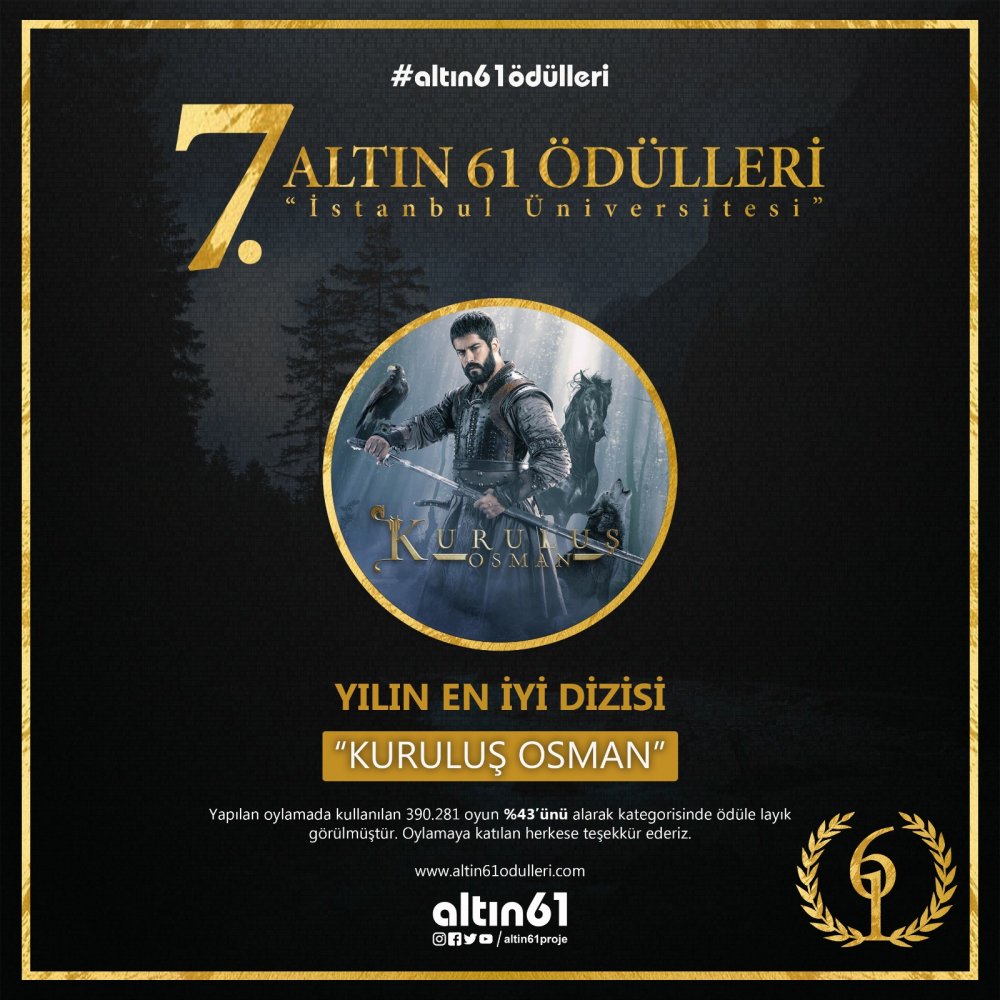 Üçüncü sezonunda yeni hikayesi ve güçlü oyuncu kadrosu ile bomba gibi girmeye hazırlanan atv’nin reyting rekortmeni dizisi ‘Kuruluş Osman’, İstanbul Üniversitesi öğrencilerinin oyları ile belirlenen Altın 61 Ödülleri’nin yedincisinde üç ödül birden kazandı.