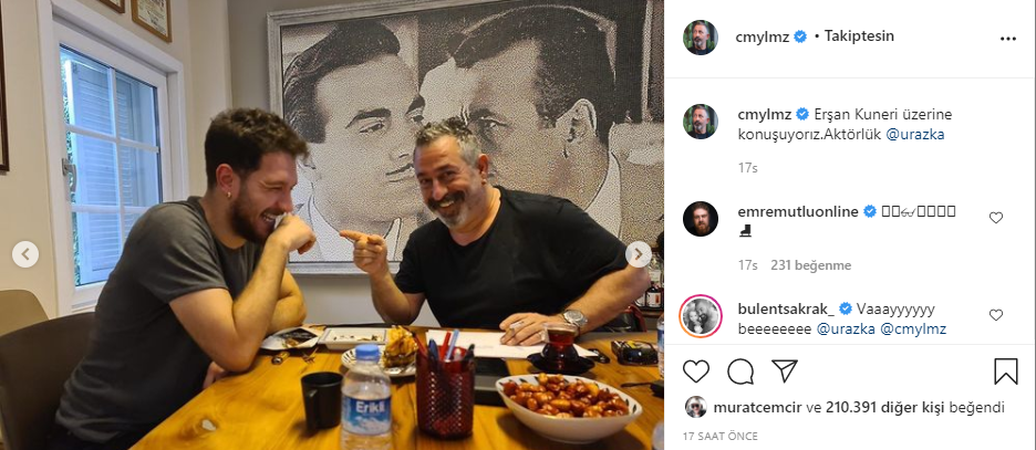 Sefirin Kızı dizisinden yeni ayrılan oyuncu Uraz Kaygılaroğlu'yla olan fotoğraflarını paylaşan Yılmaz; "Erşan Kuneri üzerine konuşuyoruz. Aktörlük" notunu düştü.